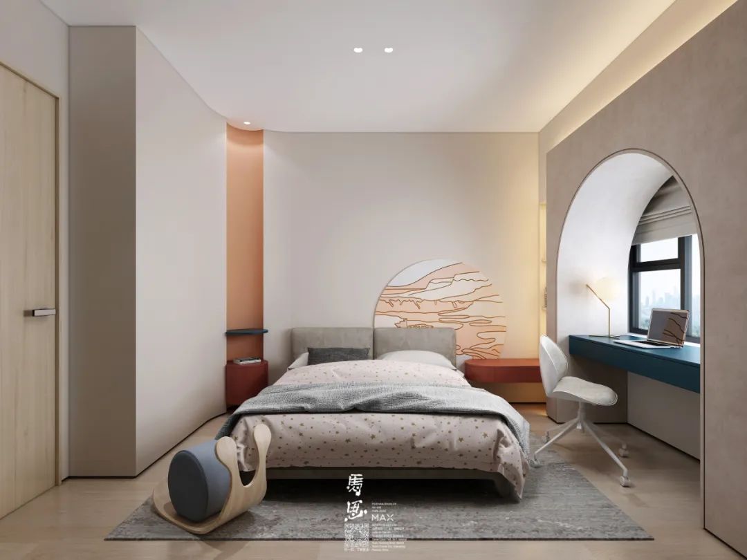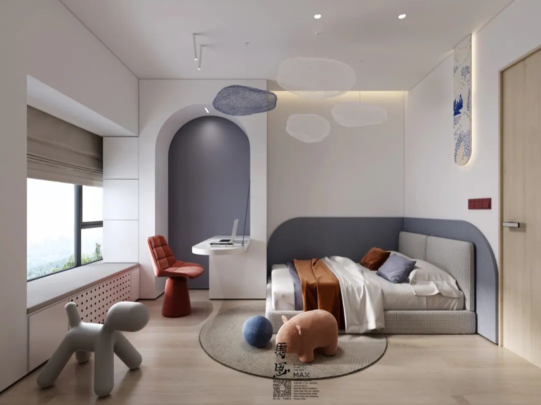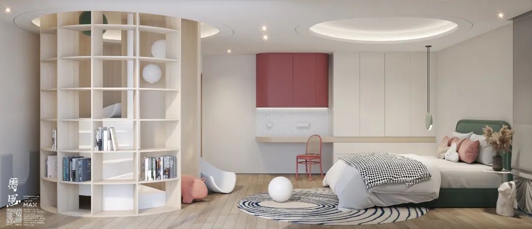 在兒童房設(shè)計專注力空間、親子空間、創(chuàng)造力空間、安全感和成長留白都是非常重要的,在不同年齡段也有所側(cè)重。